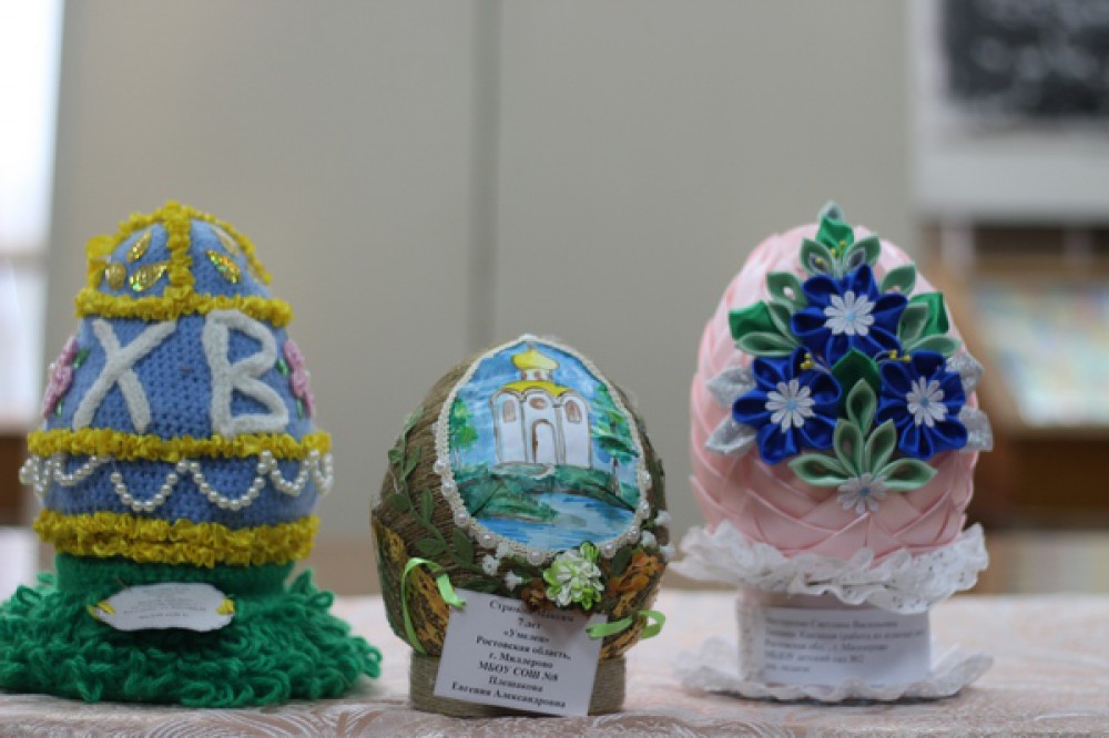 В экспозицию вошли работы дипломантов, участников регионального этапа Международного конкурса «Пасхальное яйцо 2017», предоставленных музею Отделом религиозного образования и отделом культуры Шахтинской епархии. На выставке посетитель познакомится с различными приемами оформления пасхальных яиц. Это и вышивка лентами, крестом, бисероплетение, вязание и лоскутное шитье, художественная роспись, лепка из полимерной глины. Интересны работы, выполненные в техниках квилинг (филигрань из бумаги), декупаж, украшенные джутом (шпагат, бечевка). Также в экспозиции представлены иконы, вышитые бисером, открытки к православному празднику, фигурки зайчиков, цыплят. От работ веет весной, любовью и добром.