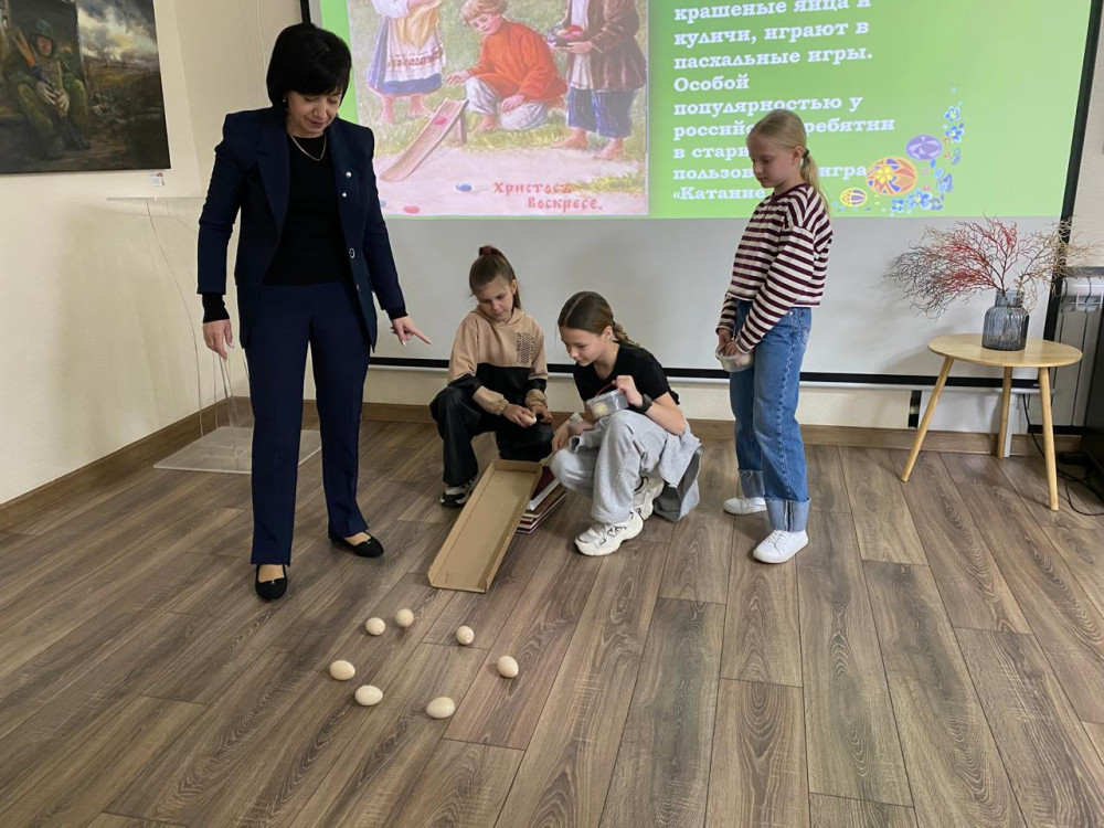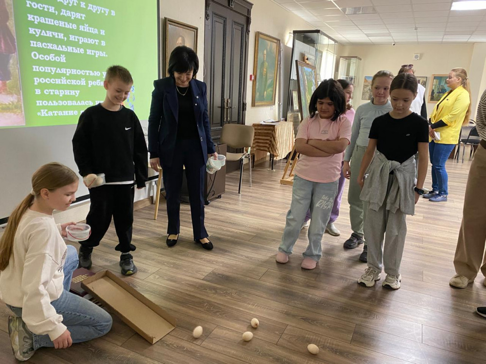 Ведущая подчеркнула, что на Пасху так же устраивались народные гуляния, игры, водили хороводы. Решив не отступать от традиций, сотрудники музея предложили ребятам поиграть в игру: «Катание яиц».