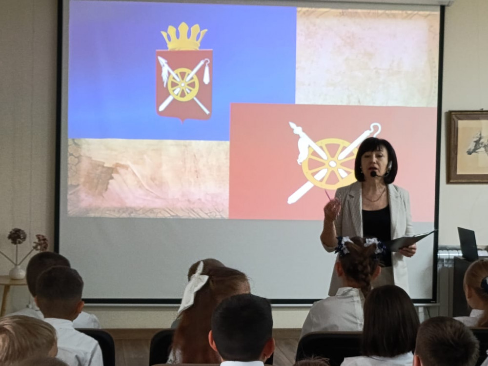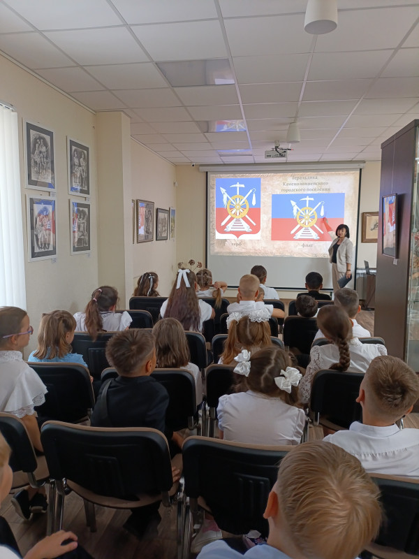 Для учащихся учащиеся МБОУ гимназии №20 в Краеведческом музее прошёл тематический час «Край родной в гербах и флагах», приуроченный ко Дню флага Октябрьского района.